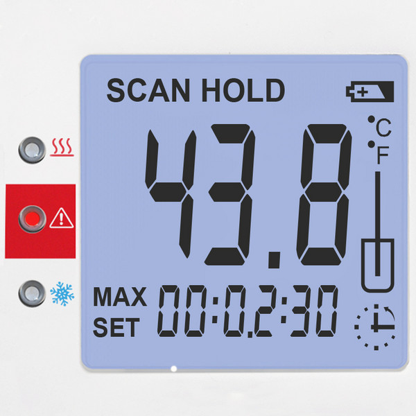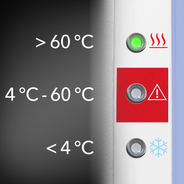 Rəqəmsal temperatur displeyinə əlavə olaraq, üç göstərici LED ölçülmüş temperaturun HACCP (Təhlükə Təhlili və Kritik Nəzarət Nöqtələri) diapazonlarında olub olmadığını birbaşa göstərir.