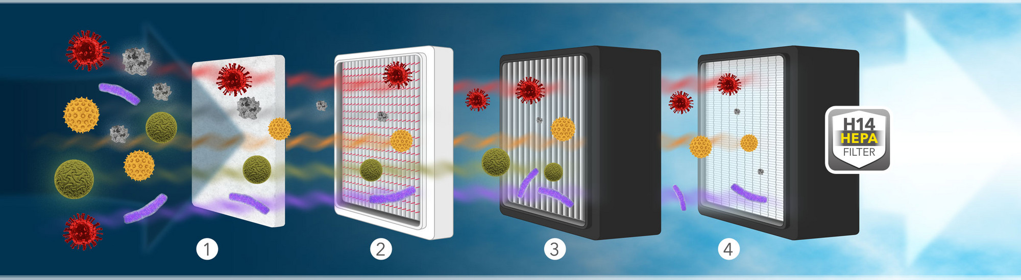The AirgoClean® One removes 99.995 % of all airborne pollutants down to a size of 0.1 micrometres from the room air: