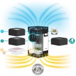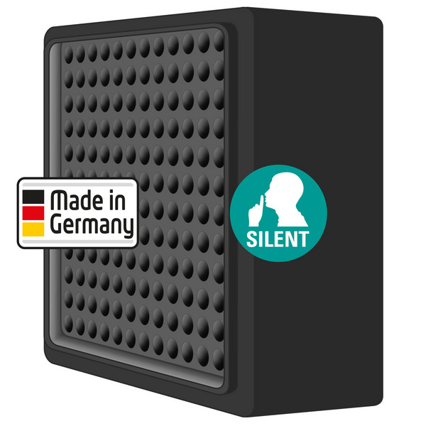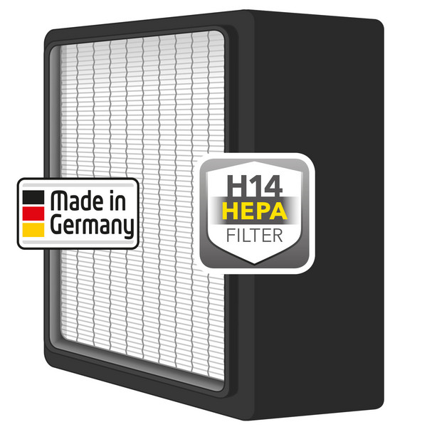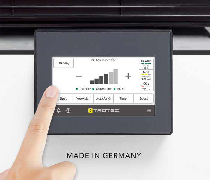 It is no coincidence that with the AirgoClean® One you benefit from an equally durable and user-friendly construction with effective 360° air routing and long filter lifetimes – after all, it is a high-performance air purifier originally produced by Trotec, developed and manufactured in Germany according to the highest quality standards, which houses only efficient branded components of the latest generation of technology supplied by leading component manufacturers. Each quality filter integrated is produced in Germany, tested and certified individually. The effectiveness of the H14 HEPA filter system of this high-performance air purifier has been scientifically proven!