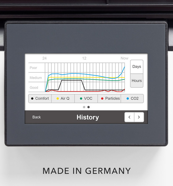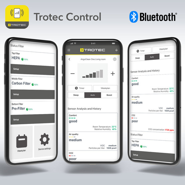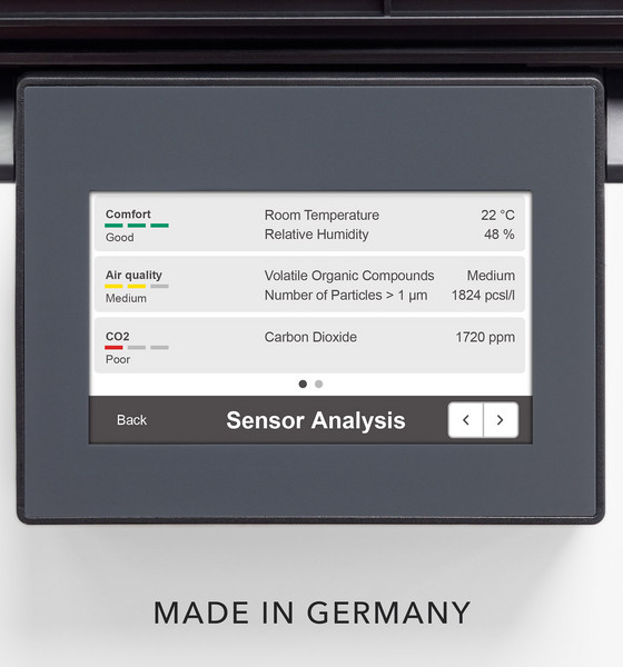 Thanks to the integrated triple air quality sensors you always keep all important air quality parameters in check. In addition to the air temperature and humidity level as room climate indicator and the degree of pollution by ultra-fine particulates, the AirgoClean® One shows the current carbon dioxide concentration in the room air. All information can also be called conveniently via app and the device can be controlled remotely.