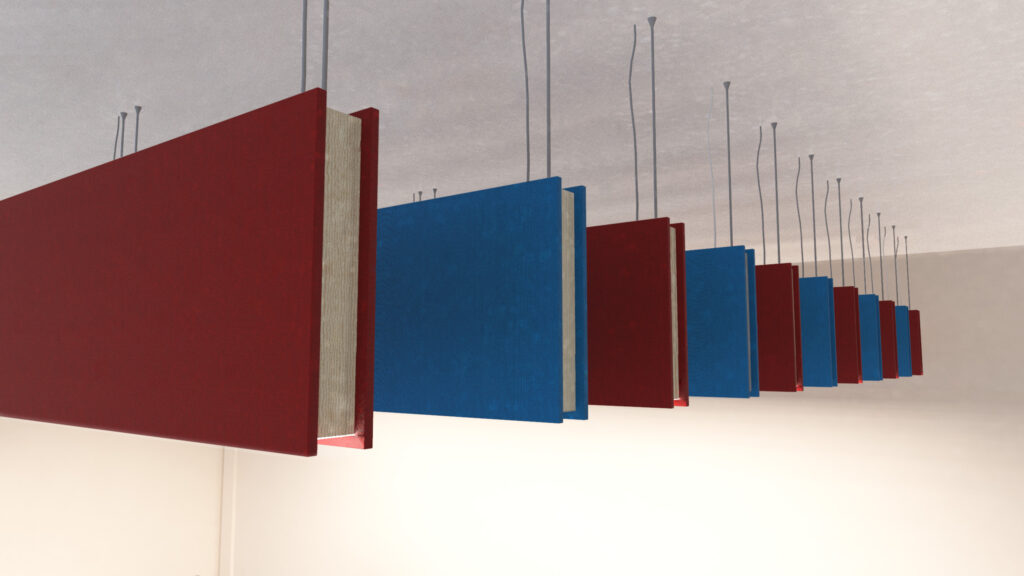 They are suspended vertically from the ceiling, according to the respective acoustic study.