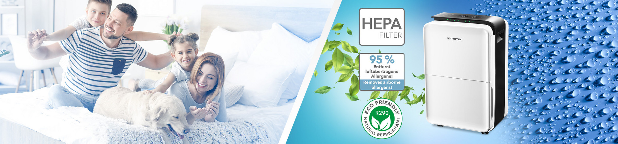 The most powerful in its class: 31 l dehumidifier + HEPA air cleaner with 95 % efficiency to protect against mould, bacteria, viruses, dust, pollen and allergens