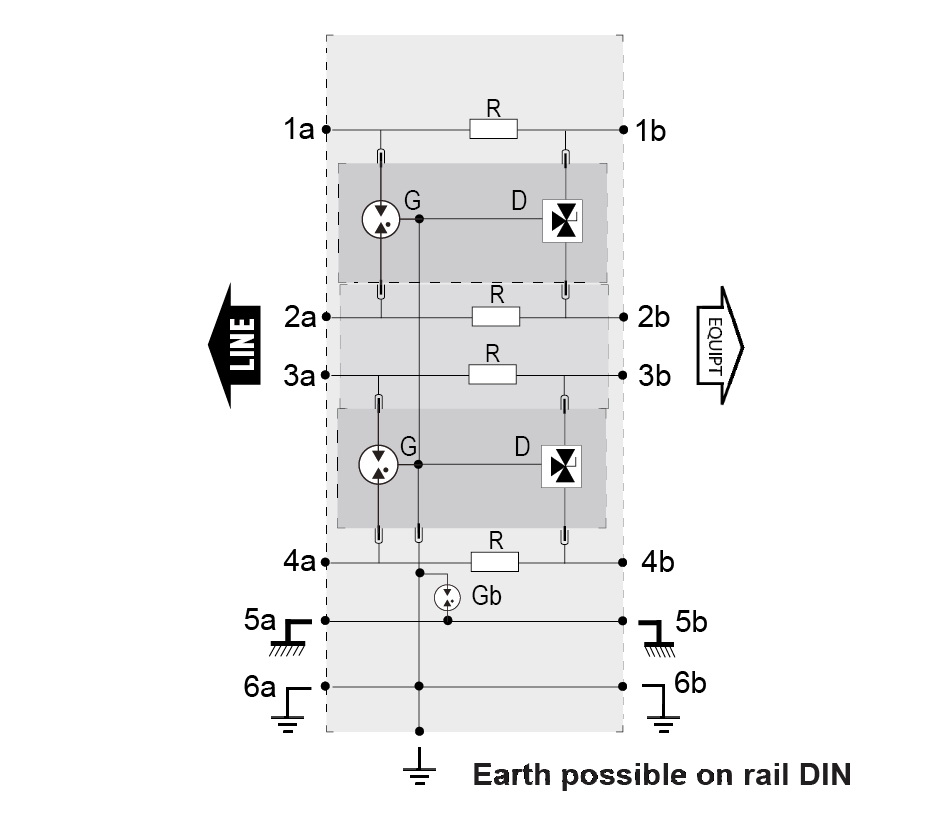 The shield connection is additionally earthed via a gas discharge tube. The earthing connection is conveniently made via the top-hat rail. When the plug-in module is unplugged, the transmission signal is not interrupted.