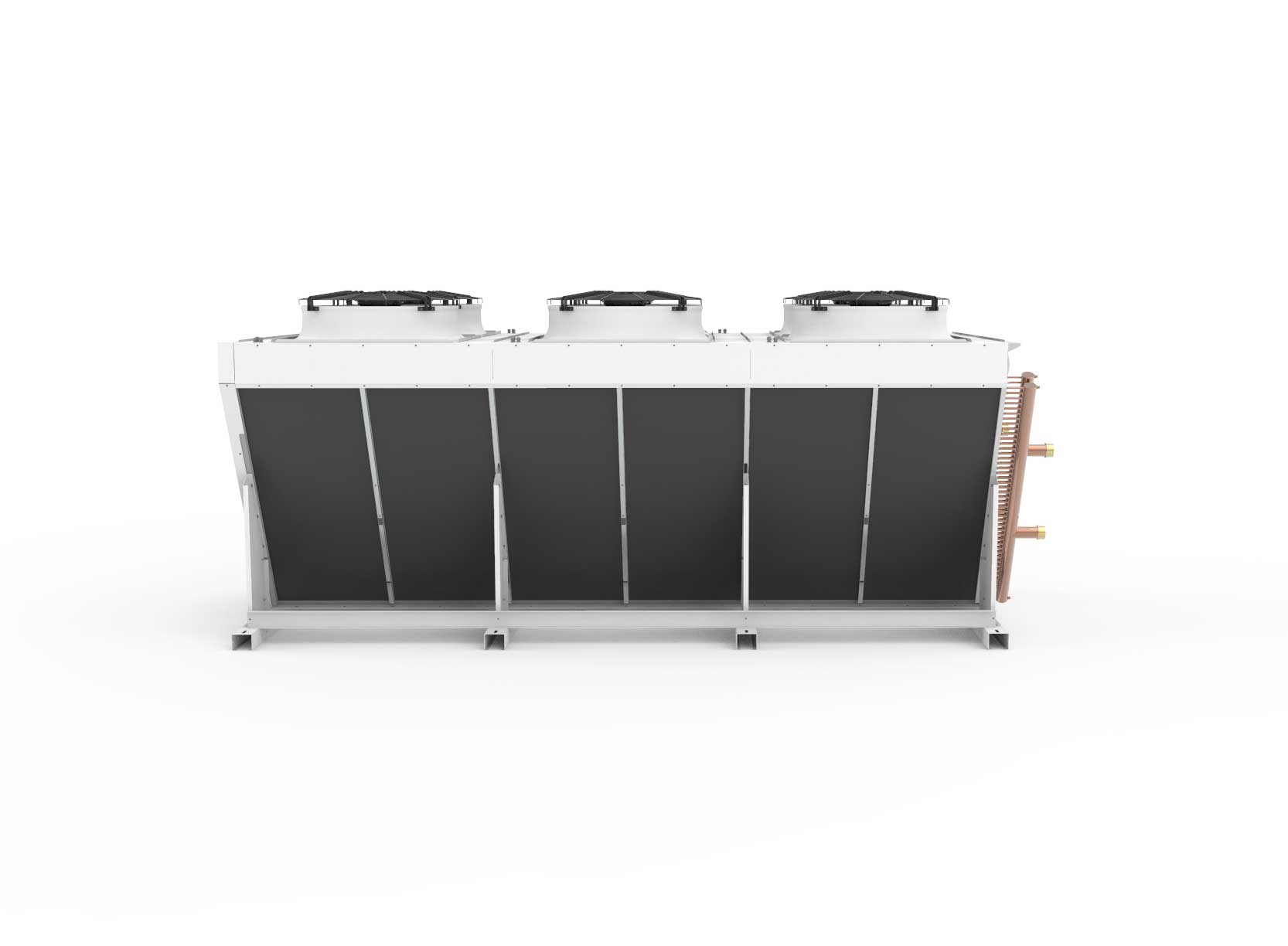ROEN EST’s V-shaped dry coolers with axial fans are suitable for out-door applications, using highly sustainable R718 refrigerant and brines. Configurable for low noise levels and capacity to exactly match sys-tem requirements. Compared to cooling towers and wet systems, our V-shaped dry coolers require little maintenance and fare highly ef-fective in preventing Legionella contamination. The V-shape is ideal for remote installations where footprint is limited.