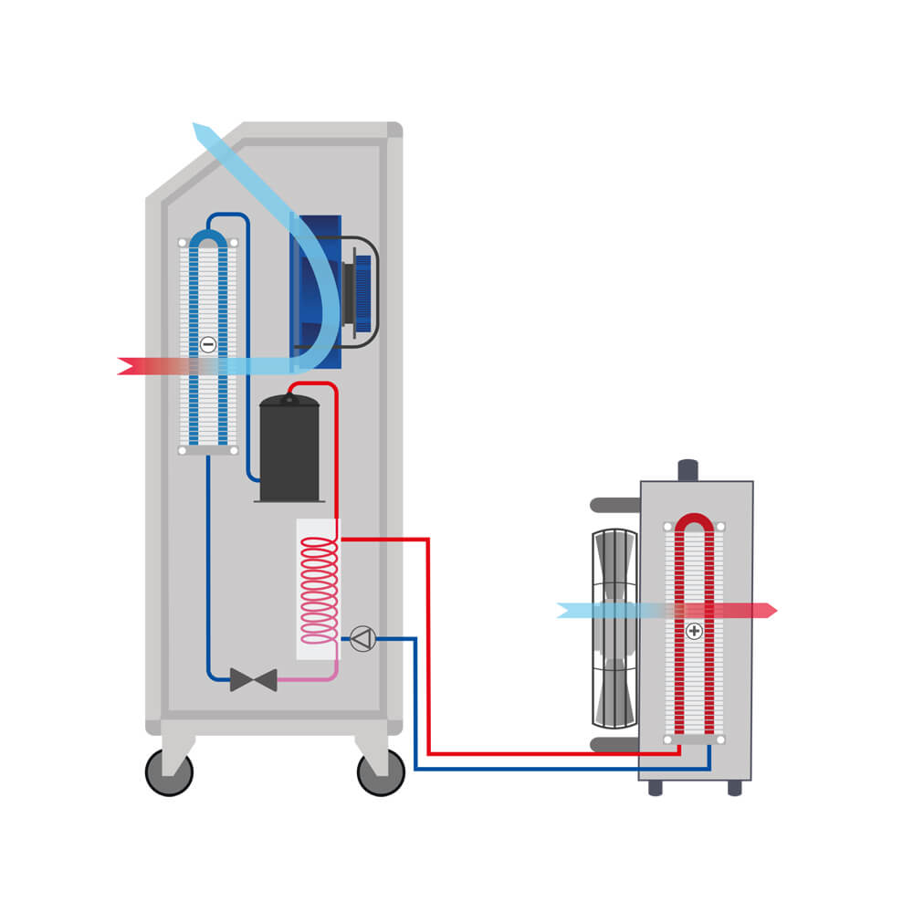 ACT 7 поглощает тепло в систему охлаждения хладагентом. Отсюда тепло передается в автономную систему охлажденной воды/гликоля. Затем она перекачивается во внешний блок, где вода охлаждается и рассеивается тепло.